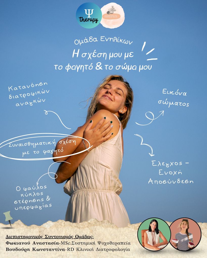 Η ομάδα είναι μία πρωτοβουλία του PSY.GR και του ΘREPSIS και απευθύνεται σε γυναίκες με δυσκολεμένη σχέση με το σώμα και την αυτοεικόνα, παγιδευμένες σε κύκλους στέρησης ή υπερφαγικών επεισοδίων, με σκοπό να κατανοήσουμε τα διατροφικά μοτίβα και να αρχίσει να χτίζεται μια σχέση με το σώμα που δεν βασίζεται στον έλεγχο, αλλά στην εμπιστοσύνη.